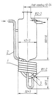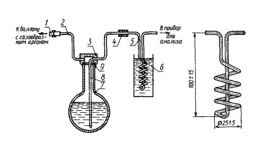 Допускается отбирать пробу жидкого аргона непосредственно в прибор для анализа через змеевиковый испаритель. При этом змеевиковый испаритель, погруженный в сосуд с водой, присоединяют к вентилю емкости с жидким аргоном с помощью трубки из нержавеющей стали внутренним диаметром 1,5-2,5 мм.