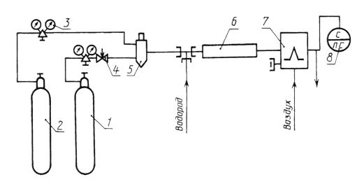 1 - баллон с анализируемым газом; 2 - баллон с газом-носителем (азотом, аргоном или водородом); 3 - редуктор баллона; 4 - вентиль тонкой регулировки; 5 - дозатор; 6 - реактор; 7 - детектор пламенно-ионизационный; 8 - измерительный прибор