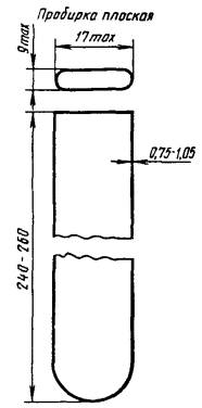 пробирки стеклянные плоские (см. чертеж), предохраняющие пластинки во время их осмотра или хранения; минимальные размеры должны быть рассчитаны с учетом размера пластинки. Допускается хранить пластинки в стеклянных пробирках круглого сечения;