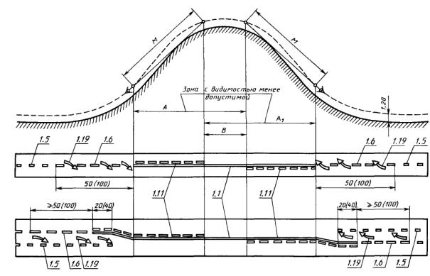 Знаки 1.1 и 1.2 должны дублироваться на дорогах с тремя и более полосами для движения в обоих направлениях, а также на дорогах с одной или двумя полосами для движения в обоих направлениях, если расстояние видимости переезда вне населенных пунктов менее 300 м, а в населенных пунктах - менее 100 м.