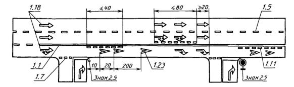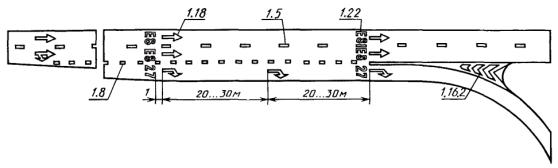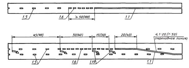 Знаки 1.4.1 - 1.4.3 должны устанавливаться с правой стороны дороги, а знаки 1.4.4 - 1.4.6 - с левой. Знаки 1.4.1 и 1.4.4 должны устанавливаться с первым (основным и дублирующим) по ходу движения знаком 1.1 или 1.2, знаки 1.4.3 и 1.4.6 - со вторым знаком 1.1 или 1.2, а знаки 1.4.2 и 1.4.5 - самостоятельно, на равном расстоянии между первым и вторым знаком 1.1 или 1.2.