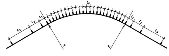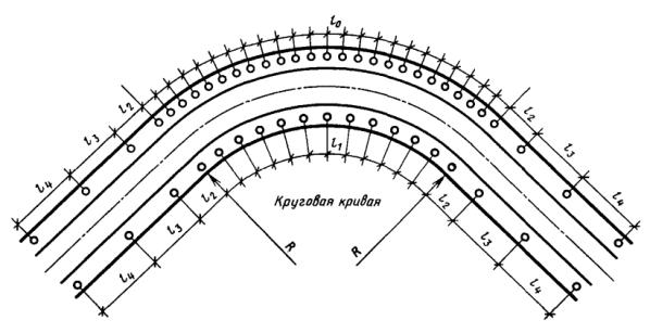 Расстояние между соседними кривыми в плане определяется между концом и началом следующих друг за другом кривых - круговых или переходных.