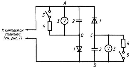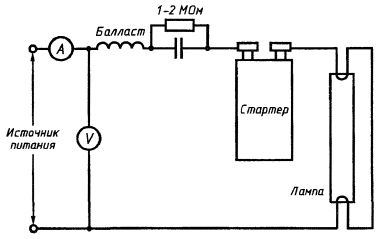 Стартеры, предназначенные для ламп мощностью до 80 Вт включ., испытывают по схеме, приведенной на рисунке 9, а стартеры для ламп мощностью 125 Вт - по схеме, приведенной на рисунке 10, с применением деактивированной лампы.