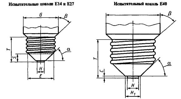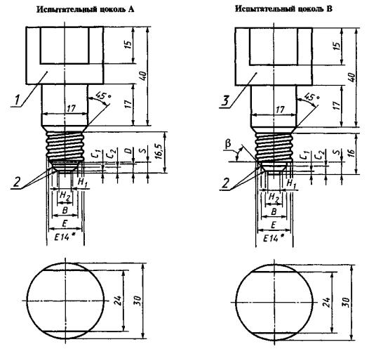 * Размеры резьбы испытательного цоколя А должны быть между максимальными и минимальными значениями, указанными в стандартном листе 7004-23 МЭК 60061-1, а размеры резьбы испытательного цоколя В должны иметь минимальные значения с допуском ± 0,05 мм, указанные в стандартном листе 7004-23 МЭК 60061-1.