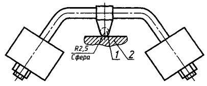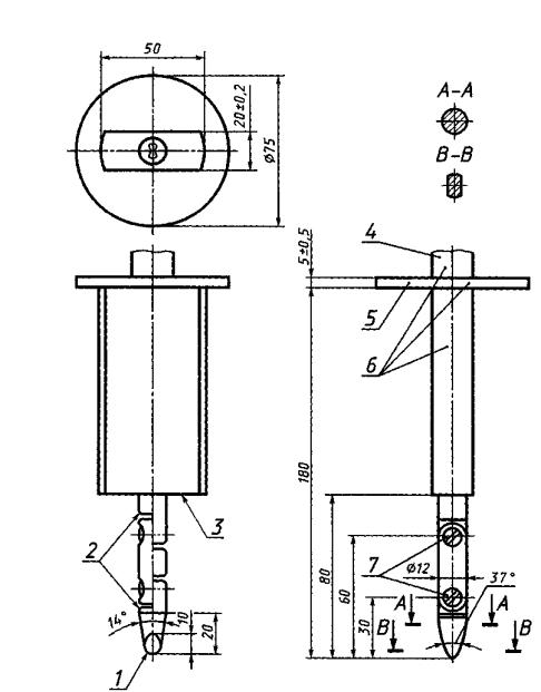1 - сферическая поверхность R4 ± 0,05; 2 - скруглить все края; 3 - ограничивающая поверхность; 4 - рукоятка; 5 - предохранитель; 6 - изолирующий материал; 7 - шарниры; 8 - цилиндрическая поверхность R2 ± 0,05