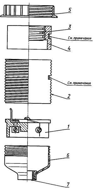 1 - сборка зажим/контакт; 2 - наружный корпус; 3 - резьбовая гильза; 4 - изолирующее кольцо; 5 - абажурное кольцо; 6 - донышко; 7 - резьбовой ввод