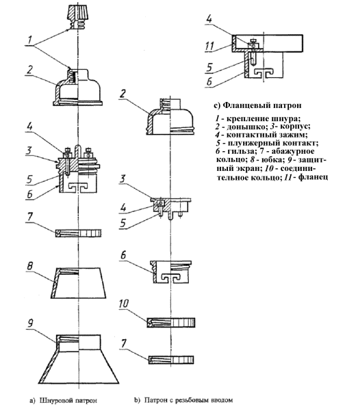2.6 юбка (только у пластмассовых патронов): Деталь, подобная абажурному кольцу, но имеющая более протяженную цилиндрическую форму, позволяющая закрыть патрон по всей его длине.