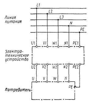 Зажимы электрических устройств, предназначенные для прямого или непрямого соединения с питающими проводами трехфазной системы, предпочтительно обозначать буквами U, V, W, если необходимо соблюдение последовательности фаз.
