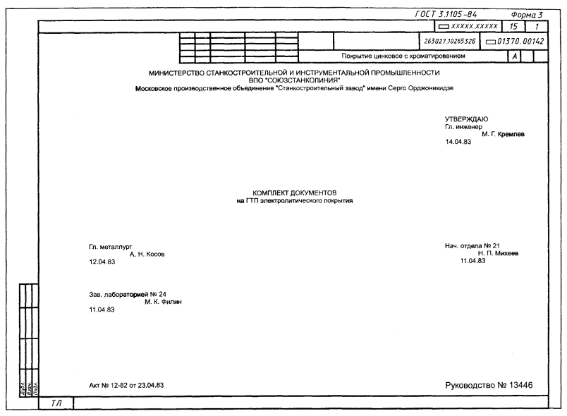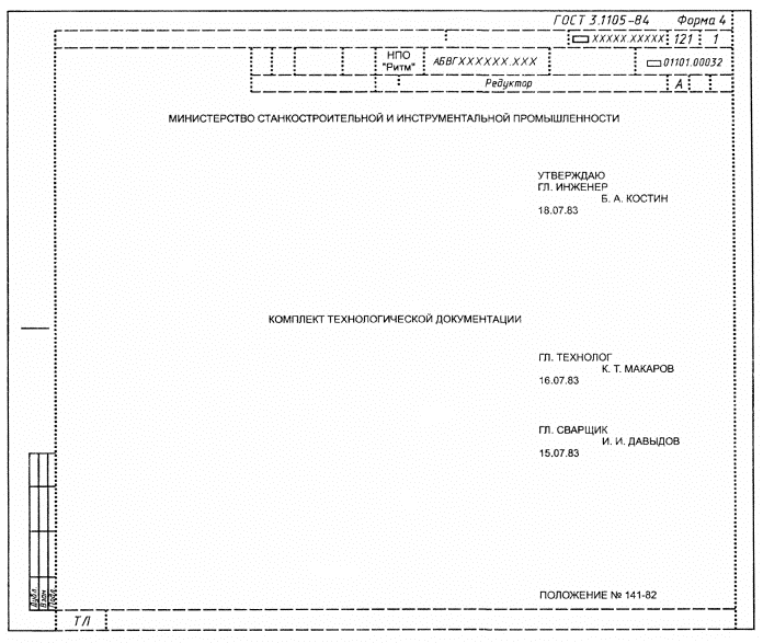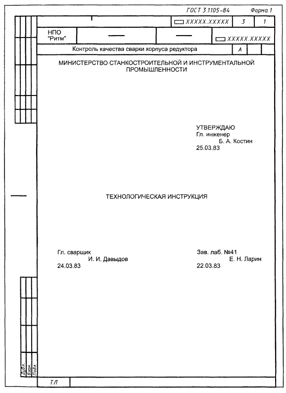 Настоящий стандарт устанавливает формы и правила оформления технологических документов общего назначения: титульного листа (ТЛ), технологической инструкции (ТИ) и карты эскизов (КЭ), разрабатываемых с применением различных методов проектирования.
