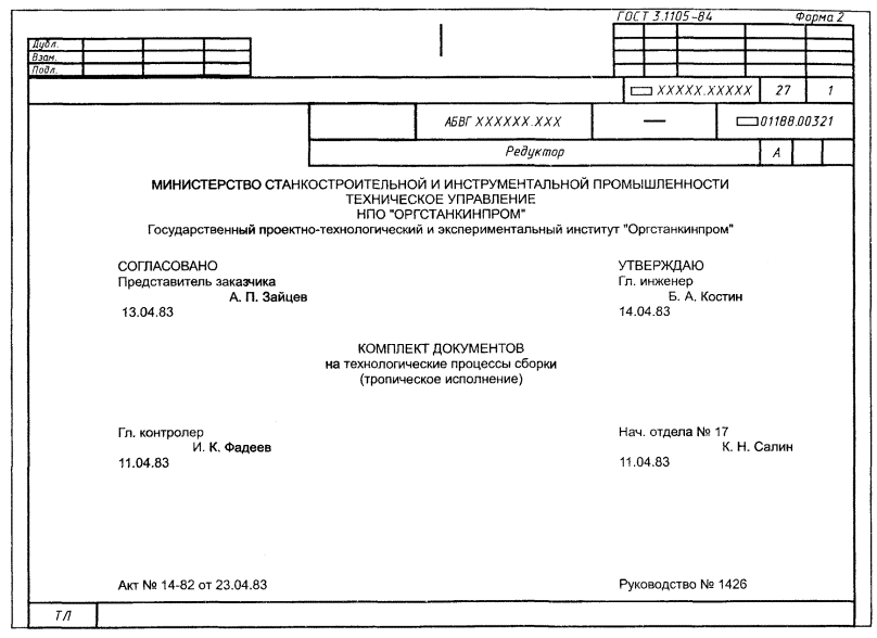 - на поле 2 - в левой части поля - должность и подпись лица, согласовавшего комплект(ты) документов (документации) от заказчика с указанием, при необходимости, наименования (обозначения) соответствующей организации, в правой части поля - должность и подпись лица, утвердившего комплект(ты) документов (документации). Расположение грифов согласования и утверждения на поле 2 устанавливает разработчик документа при подготовке к размножению бланков. Оформление грифов согласования и утверждения - по ГОСТ 6.38*.