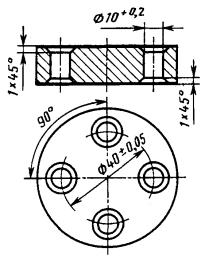 Сверлить 4 сквозных отверстия с последующим зенкованием фасок, выдерживая d = 10 + 0,2, d = 40 ± 0,05, Ð 90° ± 30 и 1 ´ 45° согласно чертежу.