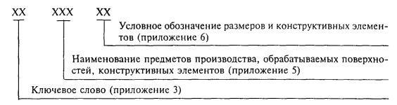 - наименование обрабатываемой поверхности конструктивных элементов или предметов производства (например, цилиндр, галтель, заготовка и т. п.);