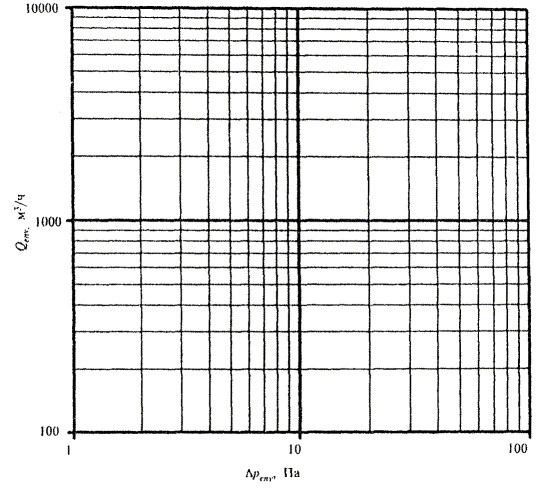 9.4 Строят в логарифмических координатах экспериментальную зависимость объемного расхода воздуха через ограждающие конструкции Qenv от разности давлений Dpenv (Приложение Б). Экспериментальные зависимости аппроксимируют прямой линией по методу наименьших квадратов и по этой зависимости определяют объемный расход воздуха через ограждающие конструкции Q50 при Dpenv = 50 Па и Q10 при Dpenv = 10 Па.