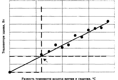 4.2 Сущность метода заключается в том, что в отопительный период для определенных интервалов времени измеряют в испытываемых помещениях (квартире) и (или) дома в целом расход тепловой энергии на отопление и среднюю температуру воздуха внутри и снаружи здания и интенсивность суммарной солнечной радиации на горизонтальную поверхность. Рассчитывают для тех же интервалов времени величины общих тепловых потерь через ограждающие конструкции здания, равные измеренным расходам тепловой энергии на отопление и суммарным теплопоступлениям (бытовым и солнечной радиации через светопроемы). По рассчитанным общим теплопотерям при соответствующих разностях температур внутреннего и наружного воздуха определяют линейную зависимость наилучшего приближения к этим данным и по линейной зависимости и внутренним размерам помещений и ограждающих конструкций вычисляют общий коэффициент теплопередачи наружных ограждений здания и удельное потребление тепловой энергии на отопление здания за отопительный период, а также устанавливают класс энергетической эффективности здания.
