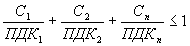 Ëèìèòèðóþùèé ïîêàçàòåëü âðåäíîñòè ó÷èòûâàåòñÿ ïðè îäíîâðåìåííîì ñîäåðæàíèè íåñêîëüêèõ âåùåñòâ â âîäå.  ñëó÷àå ïðèñóòñòâèÿ â âîäå âîäíûõ îáúåêòîâ äâóõ èëè áîëåå âåùåñòâ 1-ãî èëè 2-ãî êëàññîâ îïàñíîñòè, õàðàêòåðèçóþùèõñÿ îäíîíàïðàâëåííûì ìåõàíèçìîì òîêñè÷åñêîãî äåéñòâèÿ, â òîì ÷èñëå êàíöåðîãåííûì, ñóììà îòíîøåíèé êîíöåíòðàöèé êàæäîãî èç íèõ (Ñ1, C2... Ñn) ê ñîîòâåòñòâóþùèì ÏÄÊ íå äîëæíà ïðåâûøàòü åäèíèöó: