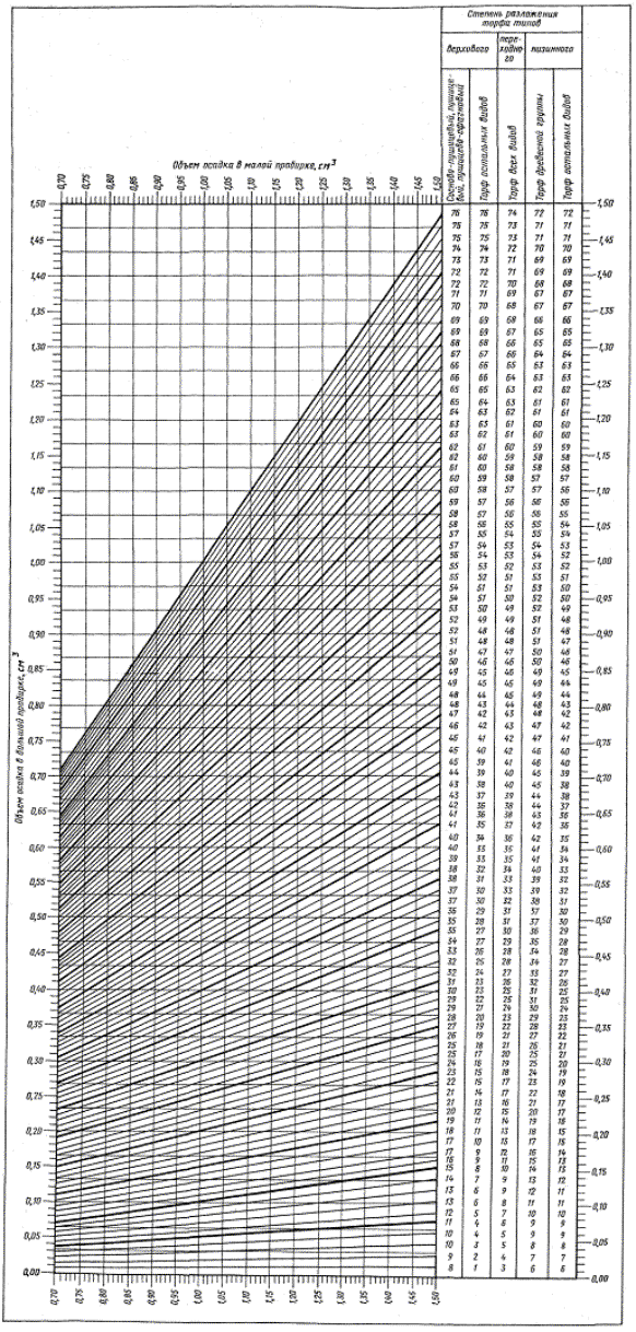 4.1. Степень разложения торфа определяют по графику, указанному в приложении 1 (вкладка), при этом на оси абсцисс откладывают объем осадка в малой пробирке, а на ординат - объем осадка в большой пробирке.