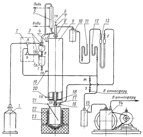 1 - буферная емкость; 2 - манифольд; 3 - приемники; 4, 6, 19, 20, 21 - термопары; 5 - обратный холодильник; 7 - конденсатор; 8, 17 - накидные гайки; 9 - ректификационная колонка; 10, 15 - ловушки; 11, 12 - ртутные вакуумметры; 13 - дифференциальный манометр; 14 - вакуумный насос; 16 - трубка; 18 - решетка; 22 - кубик; 23 - печь; А - кран трехходовой; Б - полулунный кран; В, Г, Д, Ж, Е - краны; З - кран (зажим)