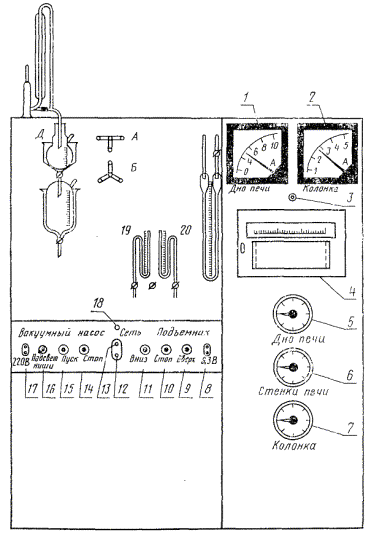 1 - амперметр на 10 А; 2 - амперметр на 5 А; 3 - сигнальная лампа для контроля включения или выключения нагрева стенок печи; 4 - потенциометр автоматический марки ПС1-08 или КСП2-027; 5-7 - автотрансформаторы типа ЛАТР-1; 8 - розетка для нагрева электрокрючка; 9-15 - кнопки управления; 16 - лампа для подсвета ниши; 17 - розетка для включения переносной лампы или для обогрева переходной трубки от крана до приемника; 18 - сигнальная лампа для контроля включения или отключения аппарата от сети; 19, 20 - вакуумметры ртутные.