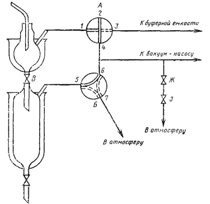 Кран Г закрывают, кран А переводят в положения 1, 2, 3 и кран Б ставят в положения 5, 6 для откачивания воздуха из нижней воронки.