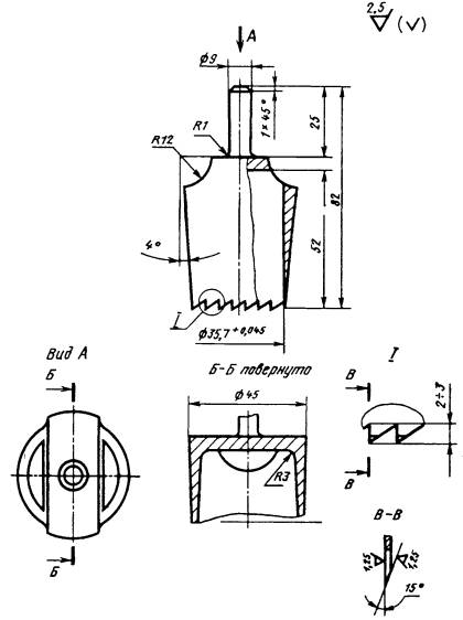 1.1.2. Образцы вырезают из материала или из изделия на сверлильном станке цилиндрическими ножами (черт. 1, 2) диаметром (50,50+0,06) мм или (35,700+0,045) мм при частоте вращения шпинделя не менее 600 мин-1. Допускается смачивать материал или изделие водой в процессе вырезки образцов и изменять размеры ножа в «хвостовой части».