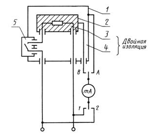 Электроды испытательной установки прикладывают к одному из токоподводящих контактов штепсельной вилки, и к шпинделю, или металлическому корпусу, или фольге, наложенной на корпус машины, выполненный из изоляционного материала (выключатель должен быть включен).