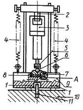 Во время испытания в испытательном приборе к машине прикладывают через упругий элемент осевое усилие, достаточное для обеспечения устойчивой работы ударного механизма.