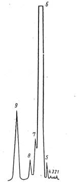 1, 2, 3, 4, 7 - неидентифицированные компоненты; 5- пентадекан; 6-гексадекан; 8-гептадекан; 9-октадекан (внутренний эталон)