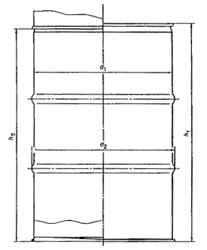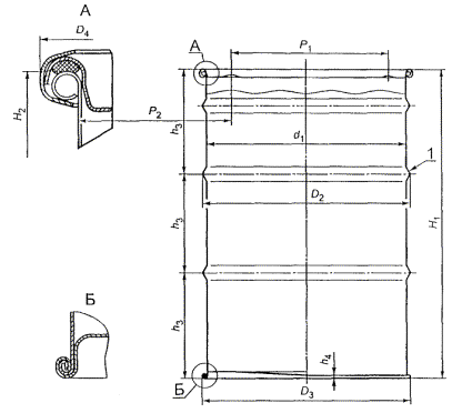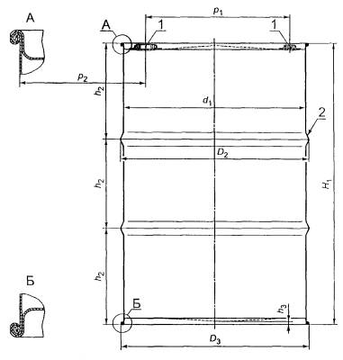 1 - горловина; 2 - гофр; d1 - внутренний диаметр; D2 - наружным диаметр по гофрам катания; D3 - наружный диаметр по закатному шву; H1 - габаритная высота бочки; h2 - расстояние между гофрами; h3 - расстояние нижнего дна от пола; p1 - расстояние между центрами горловин; р2 - расстояние от оси заливной горловины до наружной поверхности корпуса, измеренное в 50 мм от верха бочки