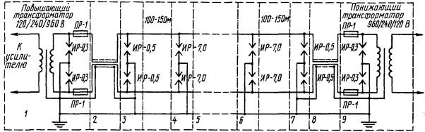 3.2.1. Трансформаторы на абонентских кабельных линиях при применении кабелей с изолированными оболочками должны быть защищены разрядниками ИР-0,3, присоединенными к выводам обмоток абонентских трансформаторов, как показано на черт. 5, без включения предохранителей СН-1,0.