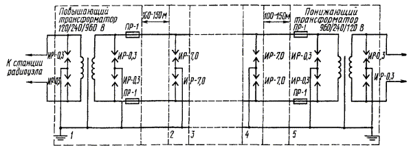К этому заземлению должны быть присоединены корпуса линейных трансформаторов, провод заземления для промежуточных стоек магистральной стоечной линии (черт. 1, 2) и разрядники.