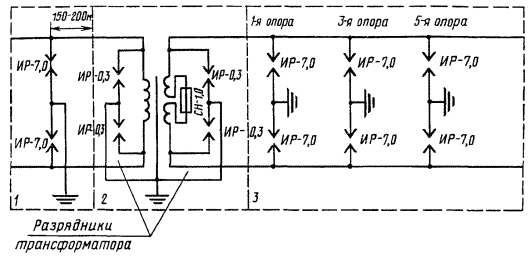 1.7. Повышающие и понижающие трансформаторы, устанавливаемые на воздушной линии (без кабельного ввода), должны быть защищены искровыми разрядниками ИР-0,3 и ИР-7,0, включенными по схеме, указанной на черт. 2.