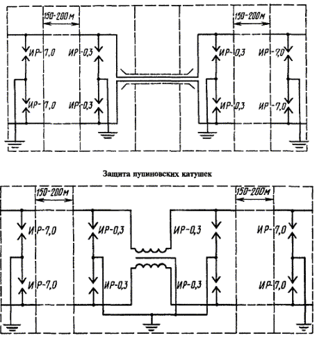 4.1. Кабельные вставки и катушки пупинизации, которые могут быть включены в разрез воздушных и смешанных линий ПВ, должны быть защищены от опасных напряжений, возникающих при грозовых разрядах, разрядниками ИР-0,3 и ИР-7,0, включенными по схеме, указанной на черт. 6.