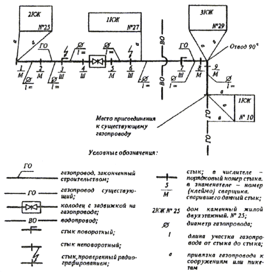 ________________________________________________________________________ (должность, подпись, инициалы, фамилия производителя работ) Пример оформления плана (схемы) сварных стыков подземных газопроводов