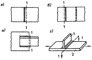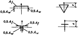 Примечания: 1. Для контактной сварки указана толщина наиболее тонкого элемента; для дуговой точечной сварки в гр.1 первая цифра - толщина верхнего элемента. 2. Сварные точки следует выполнять в соответствии с „Руководством по аргонодуговой сварке соединений элементов алюминиевых строительных конструкций"/ЦНИИСК им. Кучеренко Госстроя СССР. М., Стройиздат, 1984. |