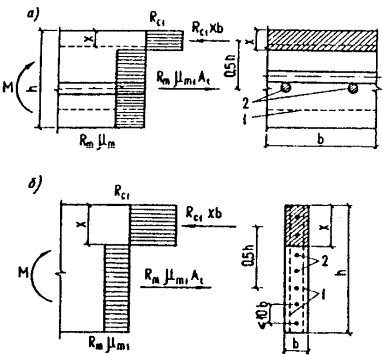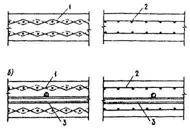 с комбинированным армированием - при их армировании указанными сетками, равномерно распределенными по сечению элемента, в сочетании со стержневой или проволочной арматурой (черт. 1, б).