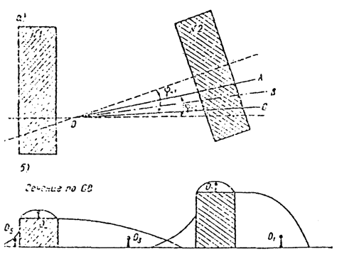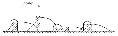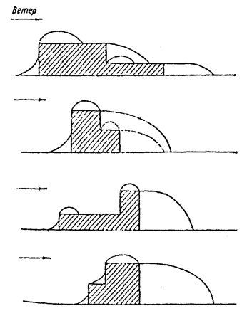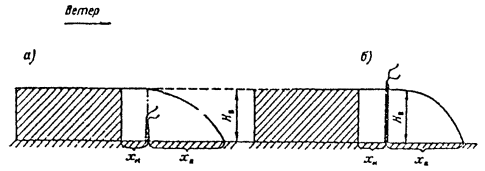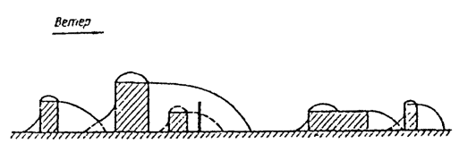 Пример 4. Котельная с теми же параметрами и при тех же условиях, что в примере 1, расположенная в ложбине. Ветер направлен поперек ложбины.