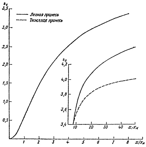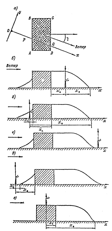 Пример 3. Котельная с теми же параметрами и при тех же условиях, что в примере 2, Расчет распределения концентрации на оси факела при скорости и = 2,2 м/с и направлении ветра, составляющем угол g = 45° с опасным направлением.
