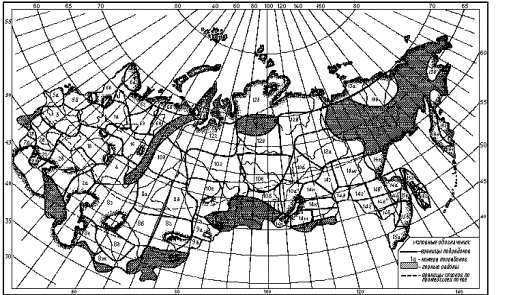 – границы подрайонов; – границы стока по промерзшей почве; – горные районы. Цифры с буквами – номера подрайонов