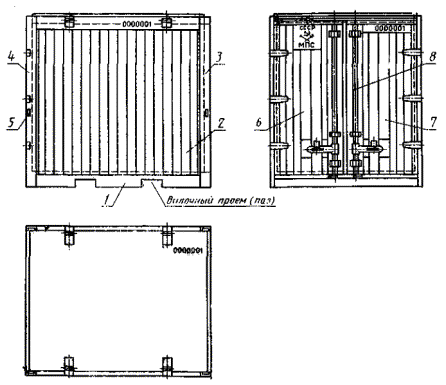 1 - нижняя рама (основание); 2 - боковая стенка; 3 - торцевая рама; 4 - дверная рама; 5 - устройство для крепления контейнера на подвижном составе; 6 - левая створка двери; 7 - правая створка двери; 8 - запорное устройство.
