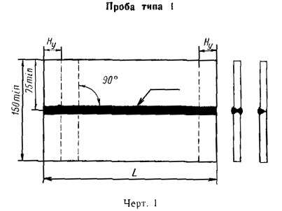 проба типа 1 (черт. 1) - для испытаний на растяжение, напряженный или ударный изгиб швов сварных соединений из листовых материалов;