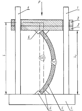 1 - направляющие; 2 - груз; 3 - верхняя плита; 4 - нижняя плита; 5 - образец; 6 - упоры.