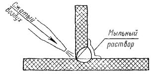 Негерметичность шва сварного соединения определяют по появлению мыльных пузырей на смоченной раствором стороне.