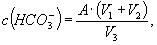 5.2. При ацидиметрическом методе измерения бикарбонат ионов (определение общей щелочности) молярную концентрацию эквивалента бикарбонат-ионов с (НСО3¯) в моль/дм3 вычисляют по формуле