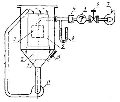 1 - проволочная сетка; 2 - порошок талька; 3 - испытуемая машина; 4 - фильтр для очистки от пыли; S - измеритель расхода воздуха; 6 - вентиль; 7 - вакуумный насос; S - манометр; 9 - стеклянное окно; 10 - вибратор; 11 - циркуляционный насос