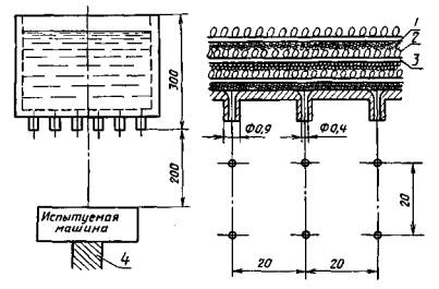 1 - слой песка; 2 - слой гравия; 3 - металлическая сетка и промокательная бумага; 4 - подставка.