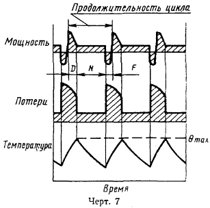 Перемежающемуся с частыми реверсами при электрическом торможении с числом реверсов в час 30, 60, 120 и 240 (если в стандартах или технических условиях не установлено иное) при коэффициенте инерции F1 1,2; 1,6; 2,0; 2,5 и 4,0; условное обозначение режима S7 (черт. 7).