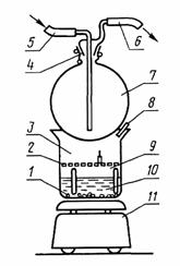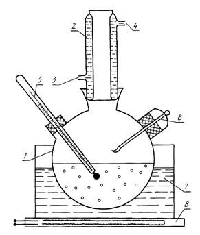 1 - колба; 2 - обратный холодильник; 3 - вход воды; 4 - выход воды; 5 - термометр; 6 - пробка с крючком для подвешивания изделий; 7 - водяная баня; 8 – нагревательный прибор