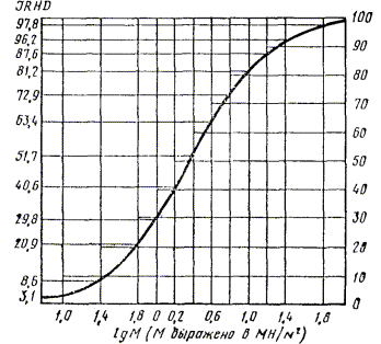 применении вероятностной кривой (интегрированная зависимость нормального распределения ошибок), связывающей lg М и твердость в единицах IRHD (чертеж). В точке перегиба lg М = 0,364, а максимальный наклон равен 57 единиц IRHD на единицу увеличения lg М.