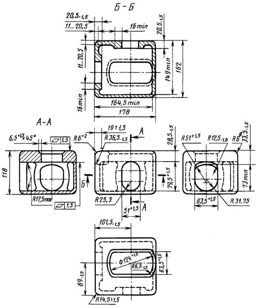 6. Наружные и внутренние радиусы закруглений, не указанные на черт. 1 и 2, должны быть 3-1,5 мм. Допускается вместо закруглений выполнять фаски 2+1´45°.