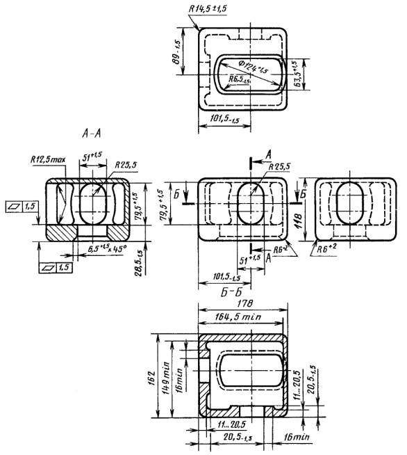 5. Конструкция и размеры фитингов должны соответствовать указанным на черт. 1, 2 и рабочим чертежам, утвержденным в установленном порядке. Допускается изготовлять фитинги с габаритными размерами 180´162´120 мм. Левые фитинги являются зеркальным отражением правых, размеры их идентичны.